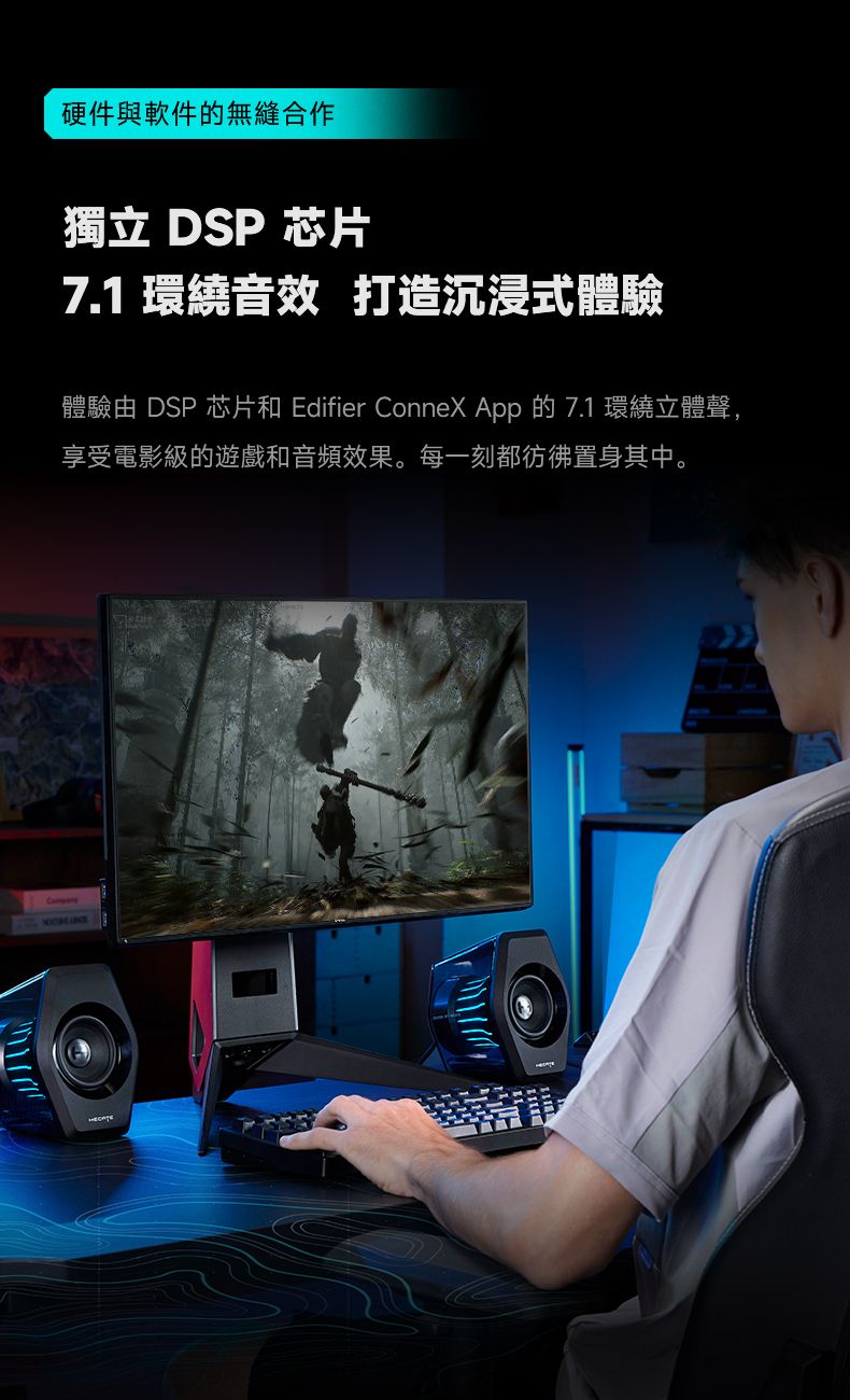 「音樂、遊戲和電影模式」- 音響系統提供精細校準的三種模式,適配音樂、遊戲和電影的娛樂偏好。