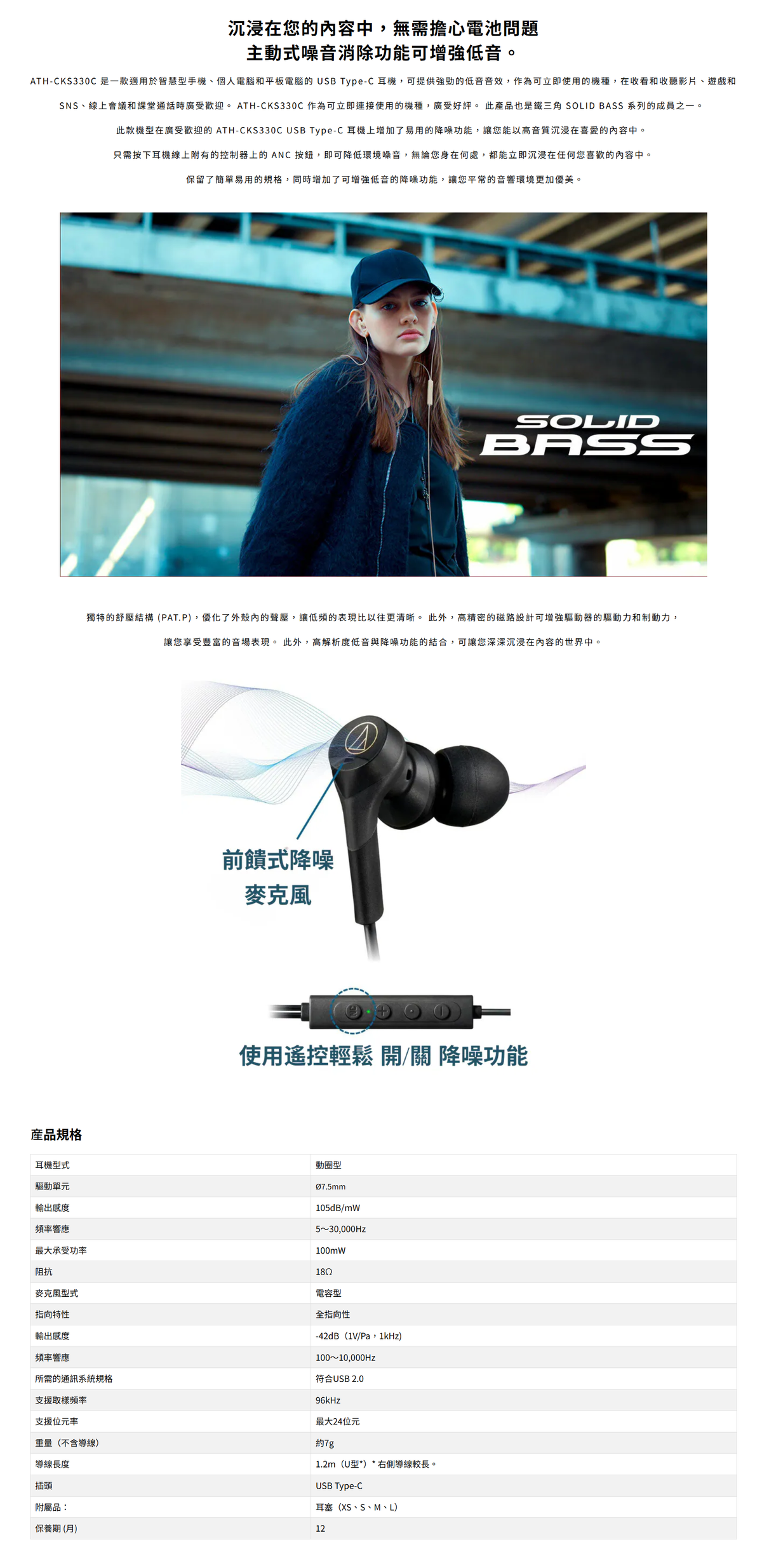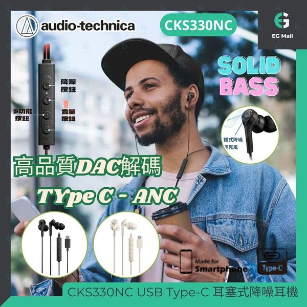 AUDIO TECHNICA - 鐵三角 ATH-CKS330NC USB Type-C 耳塞式降噪耳機 入耳式耳機 USB C 隔絕噪音 適用 iPhone16 連接 聆聽好聲音 四款抗菌耳塞