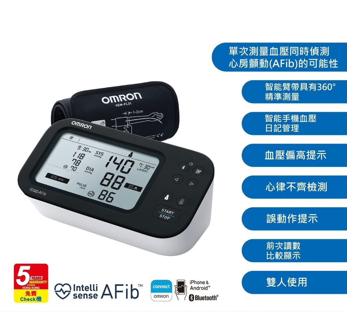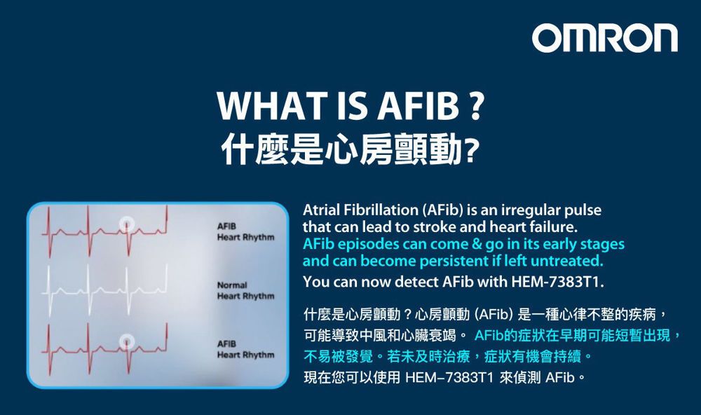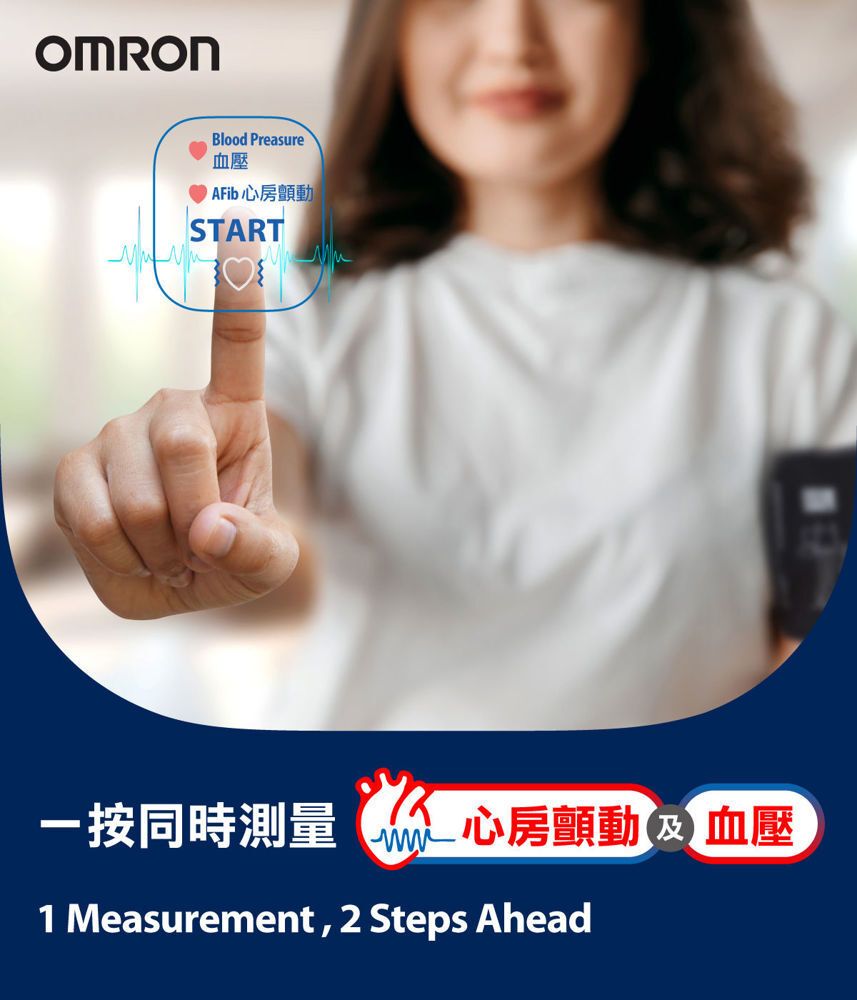 OMRON 使用 AI 人工智能算法,以 Interllisense AFib 技術利用壓力脈搏波(Pressure Pulse Waves)分析,偵測心房顫動 (AFib) 的潛在可能性,方便用戶在日常生活中監測心律,及早發現潛在的房顫風險。