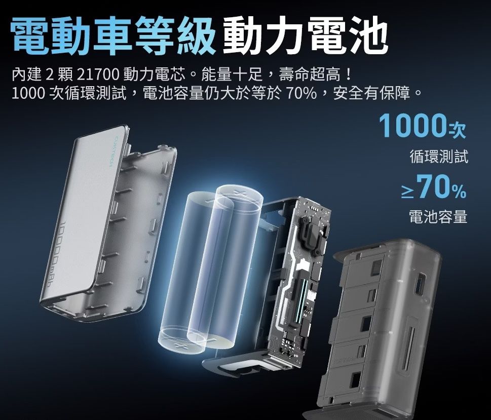 電池使用電動車等級的21700動力電芯,通過1000次循環測試,電池壽命長