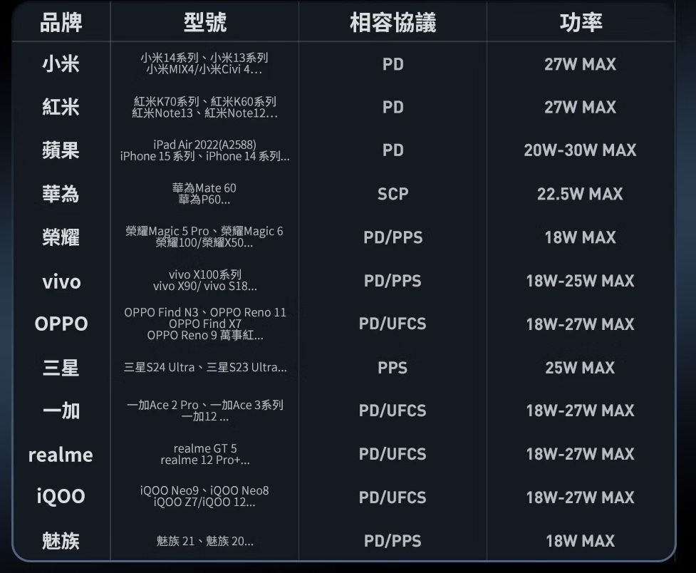 相容於PPS、PD、SCP 等多種快充協定,滿足華為、蘋果、三星、OPPO、vivo等多品牌充電需求。