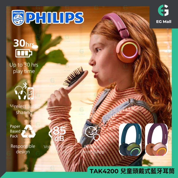飛利浦 - 兒童耳機 飛利浦 TAK4200 兒童頭戴式無線藍牙耳機 A2DP AVRCP HFP 音量保護 兒童聽力 85dB 無線 Zoom 網課 網上教學 多點連線 內建麥克風