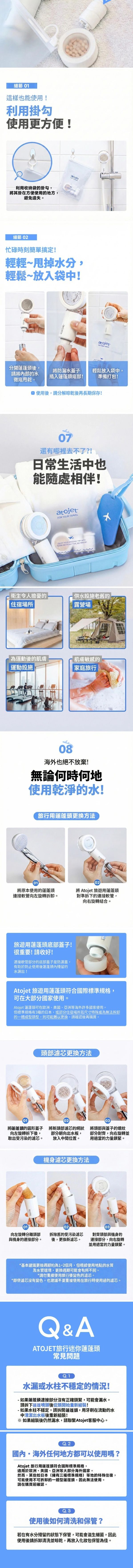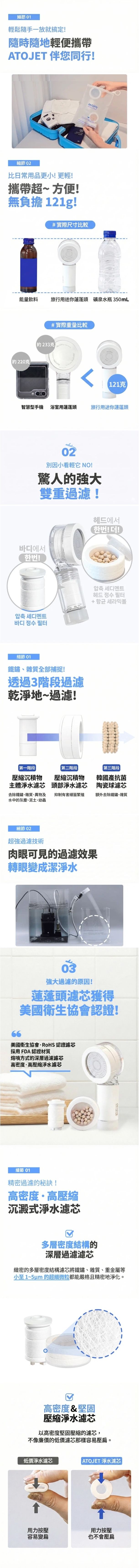 旅行最怕是遇到酒店花灑、水管污糟,這些都是肉眼不可見,可是卻在損壞你的皮膚,旅行後總是生痘痘、出油、敏感都有可能是一直用「污」水洗面。Atojet最新推出的超迷你蓮蓬頭,重量只有121g,比礦泉水樽還要迷你,放進行李箱都不怕佔位。雙重三階段過濾,將水質過濾,守護肌膚!
