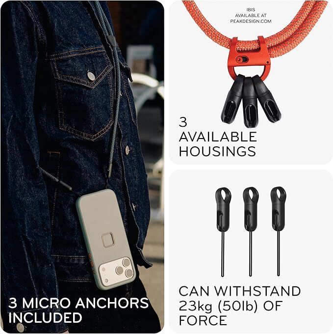 直覺的 Micro Anchor 連接系統採用雙連接點設計,讓您能夠快速輕鬆地安裝或拆卸手機或相機,避免纏繞打結。陽極氧化鋁登山扣最多可容納 3 個 Micro Anchor,並可鎖定,確保安全無虞。可調節的尼龍/聚酯編織肩帶結實耐用,略帶彈性,佩戴舒適。