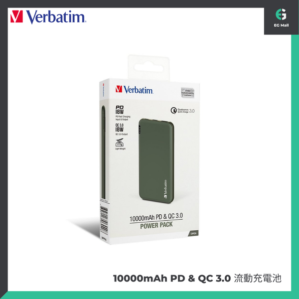 威寶 - Verbatim Power Bank 10000mAh Power Bank 充電器 18W 66440 PD & QC 3.0 雙快充 流動充電器 尿袋 綠色 雙快充 充電器 行動電源