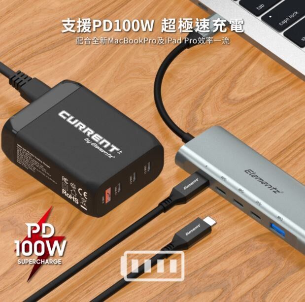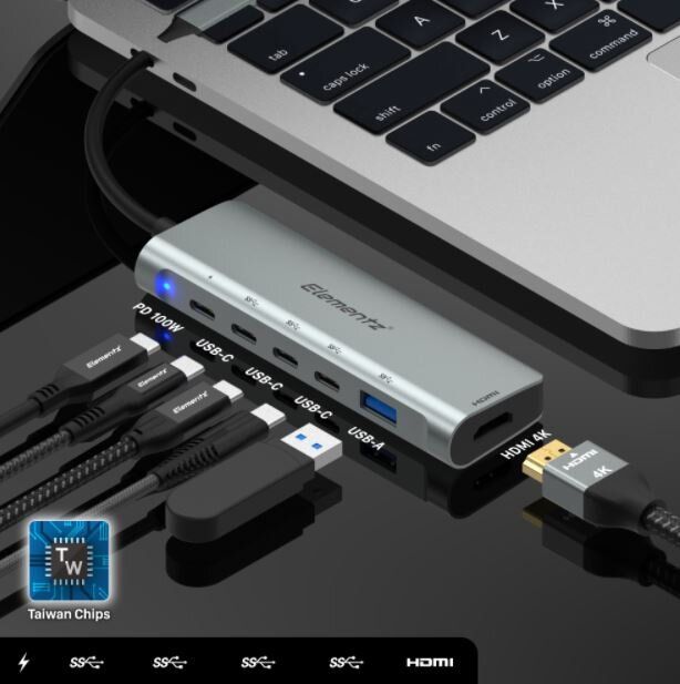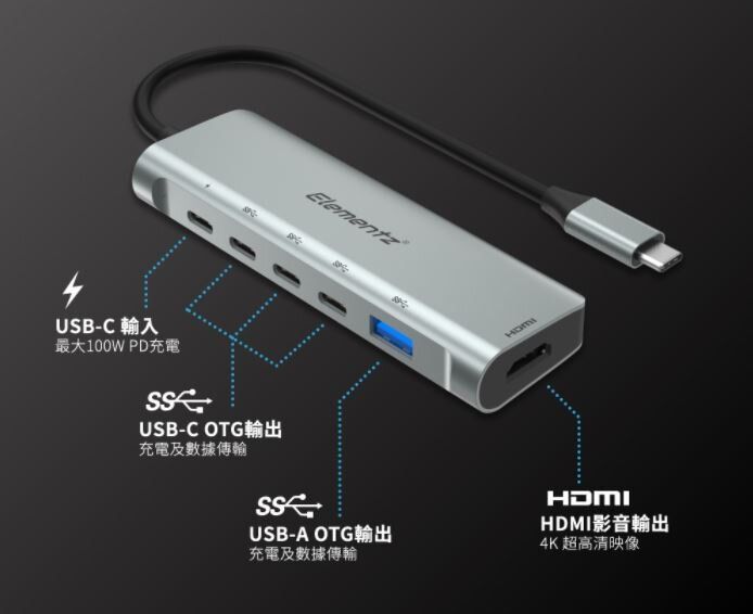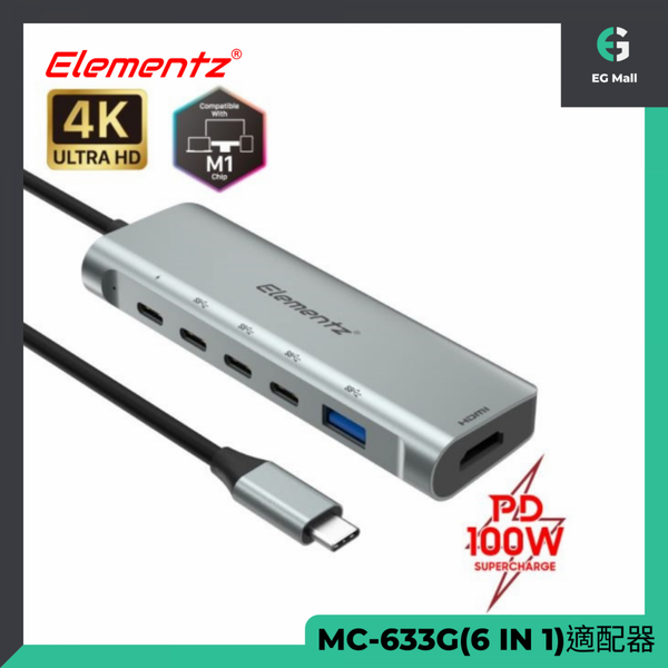 Elementz - 6 IN 1 適配器 台灣芯片 TYPE C HUB HDMI USB C PD 100W USB 3.0 MC-633G 原裝行貨